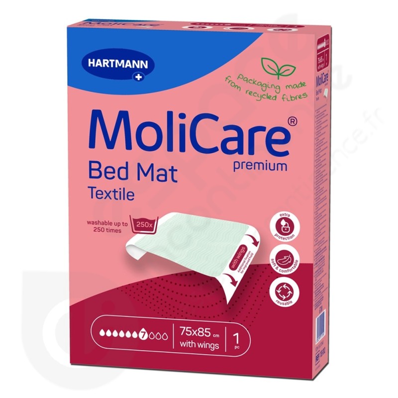 La Molicare Bed Mat Textile 7 Gouttes 75 x 185 cm (avec rabats) est une alèse réutilisable de la marque Hartmann.