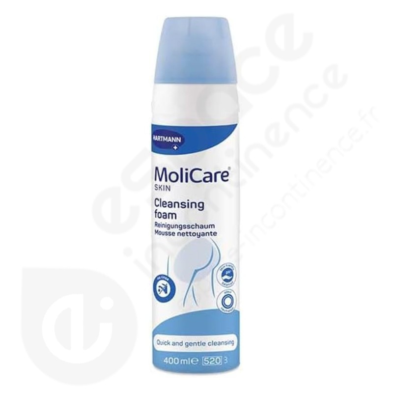 La mousse nettoyante neutralise les odeurs et est indiquée pour l'incontinence fécale, pour une toilette en douceur en cas de pertes fécales sèches ou non.