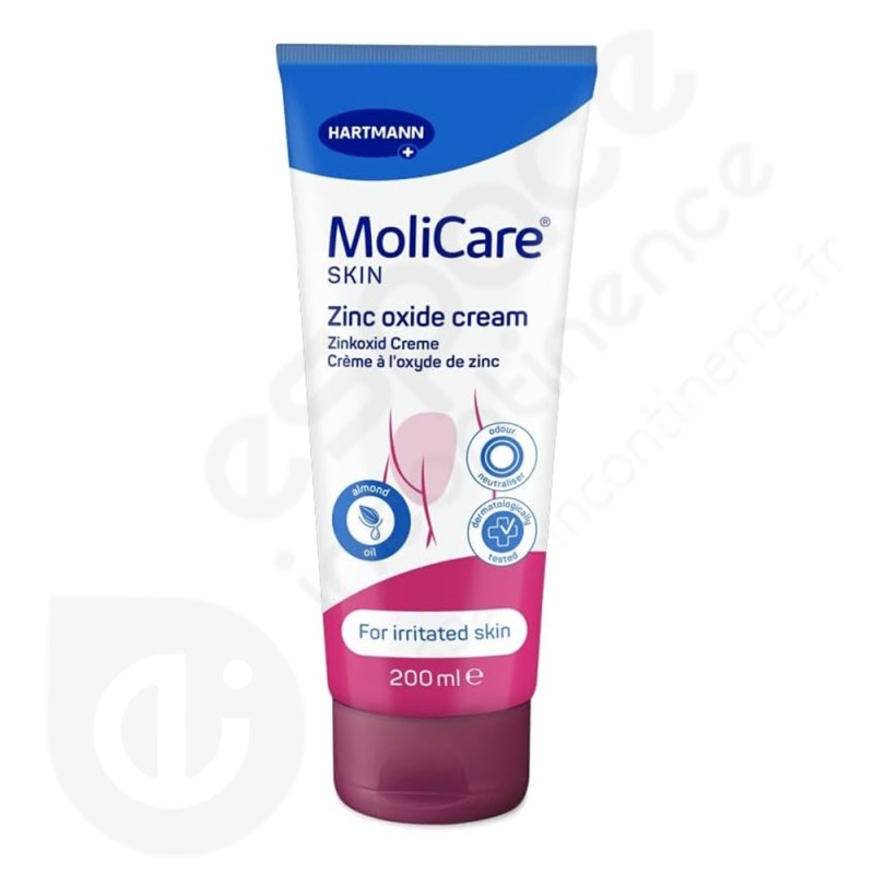La crème dermoprotectrice à l'oxyde de zinc MoliCare Skin Hartmann est préconisée pour soulager la peau des parties intimes irritées. Parce que la peau des personnes incontinentes est soumises à l'agression de l'urine et des selles, la crème dermoprotectrice Molicare Skin est enrichie à l'oxyde de zinc, aux effets antibactériens et cicatrisants. Elle contient le complexe de protection Nutriskin qui hydrate de manière prolongée la peau. Sa senteur fraîche et fruitée neutralise les odeurs.