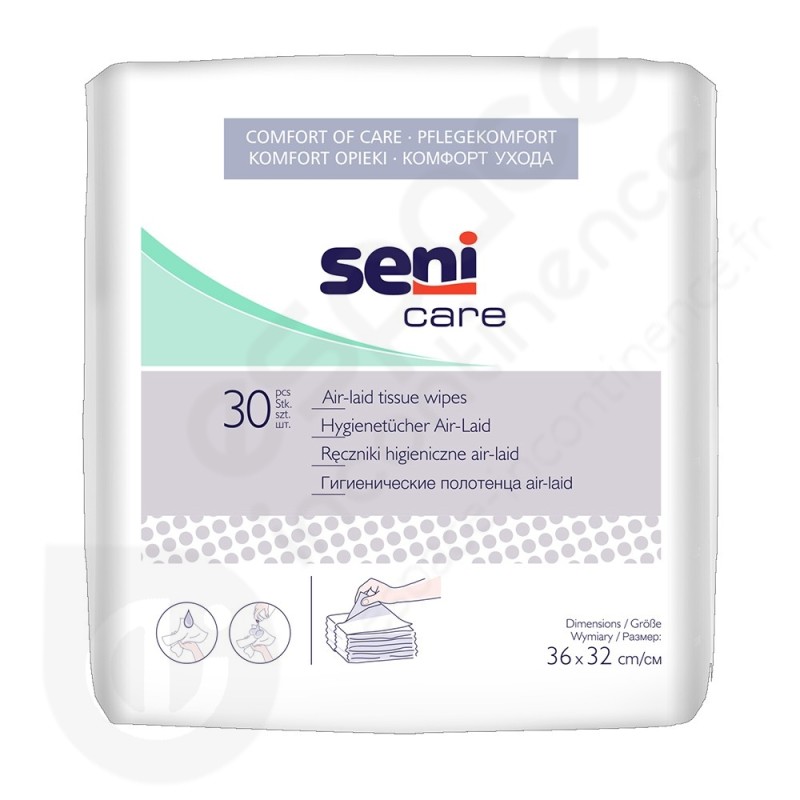 Carrés de soins Seni Care en air-laid, l'aspet tissu tout en restant jetables, ils sont très absorbants et resistants même mouillés. Agréables au toucher et délicats pour la peau.