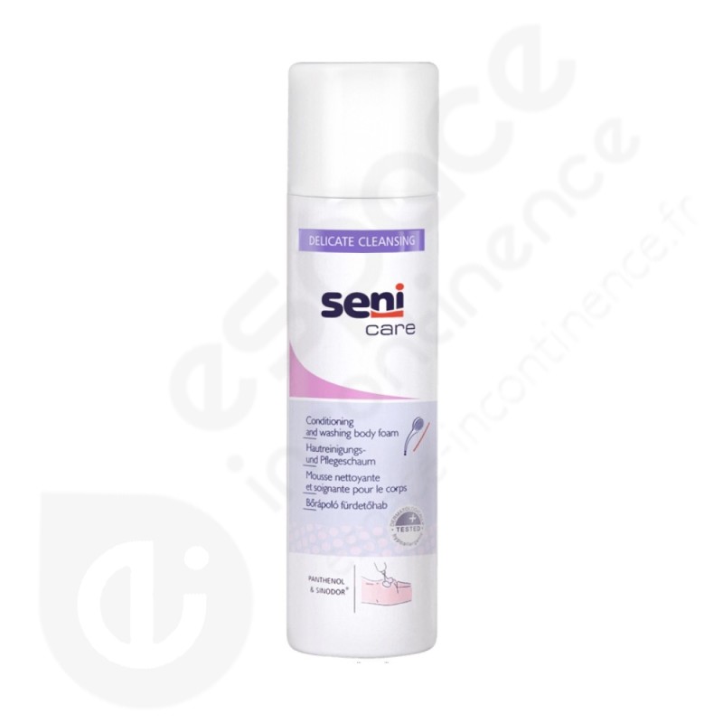 La mousse lavante Seni Care nettoie et hydrate la peau tout en respectant son film protecteur naturel. Recommandée pour la toilette corporelle quotidienne des personnes incontinentes, elle nettoie en profondeur et nourrit la peau tout en douceur. La mousse lavante contient du SINODOR, un neutralisateur d'odeur d'urine naturel.