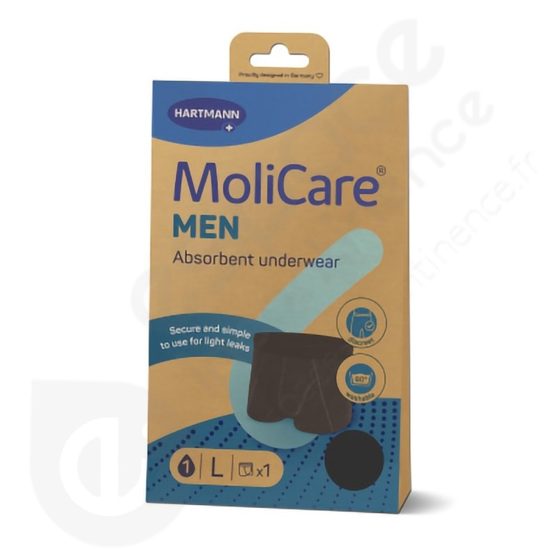 Molicare Men Lavable Sous-Vêtement Absorbant 1 Goutte est un sous-vêtement absorbant et lavable qui s'utilise avec les protections anatomiques de la marque Hartmann.